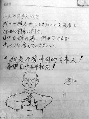 “作为一个日本人,我会反省祖先的所作所为,并思考我自己可以为中日友好关系发展做些什么。”一位日本游客画了一位抱拳道歉的日本青年形象表达歉意。