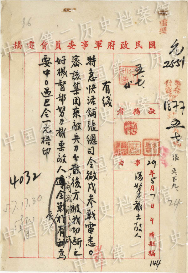 1940年5月7日,蒋介石指示战机致第三十三集团军总司令张自忠电稿(中国第二历史档案馆提供)
