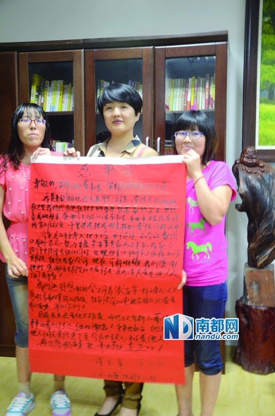 谭陈东的两个姐姐在离开医院前给宝兴医院负责人温伟娜(中)送感谢信。