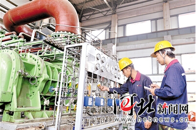 近日,工作人员在检测压缩机阀门安装情况。国内单套规模最大的焦炉煤气制液化天然气项目落户迁安九江焦化公司,该项目属于煤化工链条延伸项目和循环经济项目。项目自2014年1月正式开工,一期计划建设年产20万吨LNG液化天然气生产线;二期计划建设年产30万吨LNG液化天然气生产线。目前,一期工程已进入收尾阶段,计划10月份投产。(河北日报、河北新闻网记者耿辉 摄)