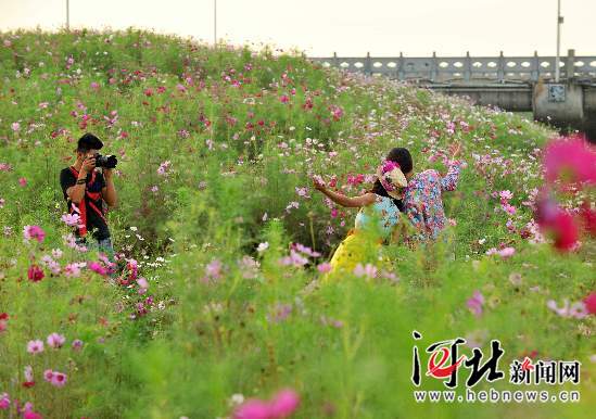 9月15日,石家庄滹沱河南岸子龙大桥东侧,一对新人正在漫山遍野的花丛中拍摄婚纱照。今年,石家庄市将滹沱河南岸子龙大桥东西两侧5座渣土、建筑垃圾山的山体和植被进行了综合整治、绿化提升,新增绿地46.6万平方米,提升绿地约10万平方米,昔日渣土山已经“变身”美丽的滨河景观带,不少新人纷纷选择在这里取景,用这里的美景为幸福添彩。河北日报、河北新闻网记者赵威摄