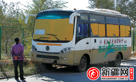 9月15日上午,记者在新疆乌鲁木齐市维斯特世纪花园小区二期33号楼旁见到了这辆奇怪的流动图书车。车身长约6米,印有“西部流动图书车”字样,车窗用黄色胶纸密封着,前挡风玻璃处贴着一个牌子,上边标有“内有大型犬,请勿惊吓,后果自负”。记者透过车门缝见到,车内有一只萨摩耶犬和一只苏格兰牧羊犬,身长均在1米左右,每当两只狗在车内嬉闹时,车身都会轻微晃动,虽然门窗紧闭,但依然有一股异味扑鼻而来。