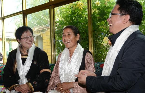 新华社照片,日喀则市(西藏),2014年9月16日 梦想,让人生出彩——记援藏博士夫妻马新明和孙伶伶马新明(右)和妻子孙伶伶在结对农民卓嘎(中)家里拉家常(9月11日摄)。在拉萨,有这样一对援藏夫妇格外引人注目:拉萨市委副书记、第七批北京援藏领队马新明和西藏社科院当代西藏研究所副所长孙伶伶。在对口援藏历史上,这对夫妻创下了多个第一:第一对援藏夫妻、第一对博士、第一对北京大学校友、第一对海外访问学者、第一对两届援藏干部。 4年前,他们离开繁华都市,毅然决然踏上援藏征程。4年来,他们视拉萨为第二故乡,扎实工作、不断进取,不辱使命、历练人生,以实际行动造福当地人民,为当地发展尽绵薄之力。因报效祖国、奉献边疆,他们的人生焕发异彩、梦想成真…… 新华社记者觉果摄 ![]()