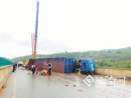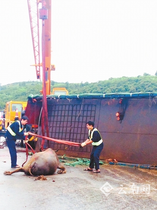 云南:拉牛车高速路侧翻 数十头水牛被甩出(组图)