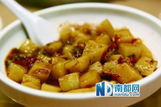 擂辣椒茄子,这道菜在小芙蓉餐厅,不可不说。现在的湘菜餐厅,大多有这道菜,而这道菜最早的出处,就在小芙蓉。小芙蓉餐厅的老板欧阳海林是厨师出身,湖南株洲人,这道菜,也来自于他。之后这道菜的身影在深圳各大湘菜餐厅都能看到,而小芙蓉餐厅有其独到的做法,茄子去皮切条过油后捞起,而辣椒则不能放油,直接在锅中“擂”熟,待与茄子交汇后,放入调料起锅,吃起来软烂可口,非常下饭。