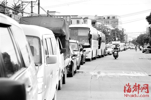 昨日下午4时许,记者前往螺洲镇,一下三环路,车辆就只能缓慢通行。该路段只有两个车道,杜园村地块往三环方向已经开修,来往车辆只能在三环往螺洲镇方向的一个车道上行驶。一个方向的车辆行驶时,对向行驶的车辆就只能停在路边等候,通往三环的车辆已经排起了长龙。车主庄先生告诉记者,这是螺洲镇通往三环的唯一通道,每次路过这里都要等,最长还等过一个多小时。