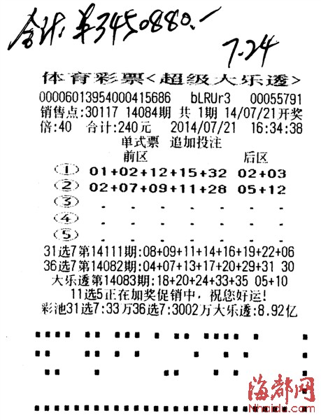 40倍机选追加单式票擒大乐透345万