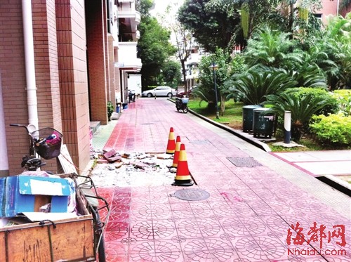 昨日记者在现场看到,5号楼前通道正中间位置被围出了一个正方形,中间地砖被挖走,但无人施工。通道宽约5米,建电梯位置大约占了一半。