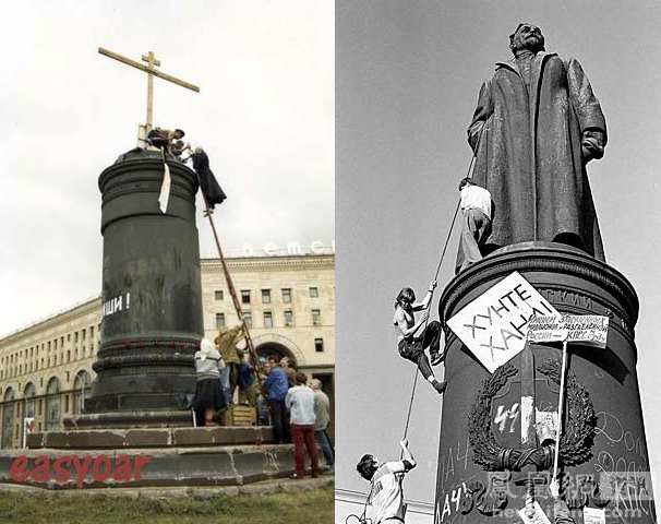 资料图:1991年,曾经在卢比扬卡广场中央的捷尔任斯基铜像被抗议者们涂鸦并且拆除。费利克斯·埃德蒙多维奇·捷尔任斯基,原苏联党和国家早期的主要领导人之一,曾任联共(布)中央政治局候补委员、全俄肃反委员会主席、苏联最高国民经济委员会主席等职。克格勃(KGB)的创始人。