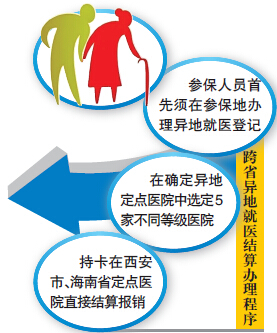 异地居住在西安市、海南省的参保人员,首先须在参保地办理异地就医登记,并在确定异地定点医院中选定5家不同等级的医院。办好这两个手续,异地住院才能持卡即时结算。