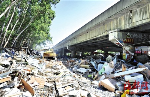 报道见报后,桥下违建隐藏的消防隐患引起相关部门重视。昨日上午,福州市高速公路交通综合执法大队、福州高速公路管理公司联合上街镇政府,出动500多人,对桥下5000多平方米的违建进行拆除。