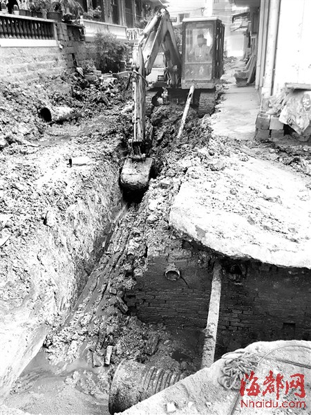 昨日上午9时许,记者来到荔城大道龙桥市场段,看到辅道上立有一个市政施工提示牌,老旧小区连接辅道的道路被挖开一条宽约1米的口子,沿着被挖开的路面往小区走,一台挖掘机正在挖沟壑。现场施工人员告诉记者,他们正在对小区雨污排水进行改造,沟壑中铺设的就是500mm口径的雨水管道,与荔城大道的市政雨水管道相连接。