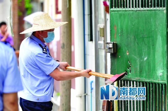 9月17日,广州南田路昆仑一街,警察用斧头凿开铁门,取走“9·16”缉毒枪战留下的子弹。 南都记者梁炜培摄