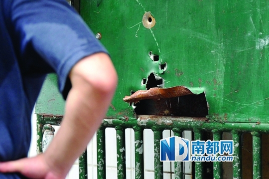 9月17日,广州南田路昆仑一街,警察用斧头凿开铁门,取走“9·16”缉毒枪战留下的子弹。《讲武堂》栏目专家认为,奥地利格洛克手枪威力在54式手枪之上,再加上配有钢芯子弹,击穿目前警用的G A 3标准防弹衣完全有可能。