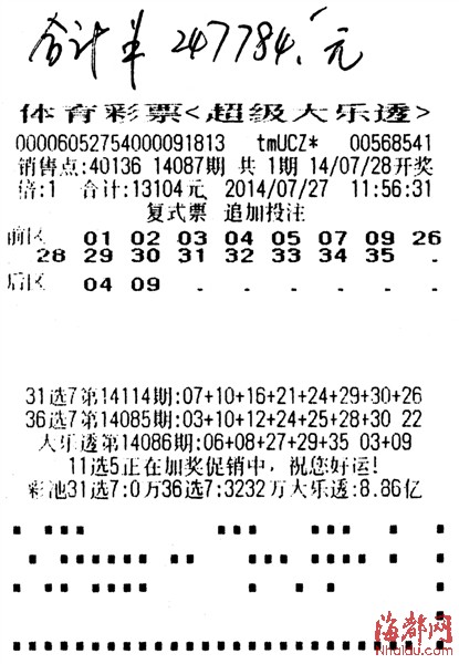 选好号后,她老公便背着她,把号码拿去投注,还进行了追加,花了13000多元。后来,黄女士特地问了她老公,选了那么多号,要多少钱,她老公风趣地说:“没多少钱,你就别想太多了,到时中奖了,你去领奖就好了。”7月28日晚,当她老公告诉她,那张复式票中了二等奖时,她非常兴奋,就问:“奖金多少?”当她听到有20多万时,心里感觉特别美。
