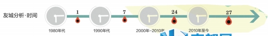 交友时间轴上,2012年交友最频繁,一年内共结交8个友好交流城市;其次是2013年,结交7个友好交流城市;排在第三位的年份是2006年,友好交流城市新增6个。