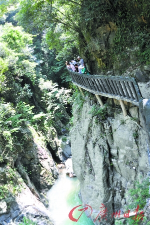 前日上午,记者沿着蜿蜒的山区公路,来到坐落在丰顺县八乡山镇的和乐村与马山村之间、海拔600多米的八乡山大峡谷山顶入口,但见云雾缭绕,栈道若隐若现,峡谷中充满神秘。