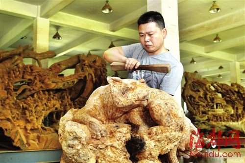 “要是几天不创作,我就觉得浑身不舒服。”余春洲说,在师父的指点下,自己刻苦钻研,2011年,他在第三届“艺鼎杯”全国木雕现场创作比赛中获得金奖。