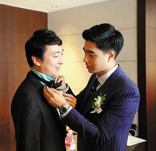 新郎袁成杰(右)细心地给王思聪整理领结