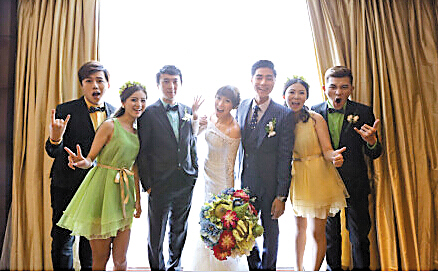 王思聪(左三)与一对新人和其他伴郎伴娘