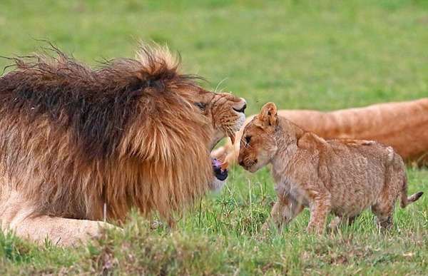 一头刚出生几个月的小狮子主动走到爸爸面前,张开自己的小嘴巴冲着雄狮“吼”起来,似乎是想引起后者的注意。