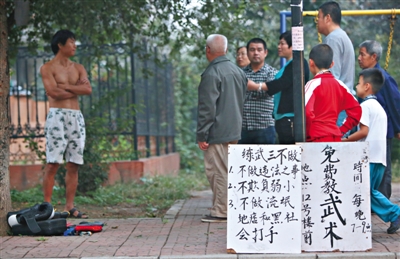 8月2日,马连华的免费武术班开张了。晚上7点,马连华在小区12号楼前的空地上竖起“免费教武术”的牌子,牌子上还注明“练武三不做:1,不做违法之事;2,不欺负弱小;3,不做流氓地痞和黑社会打手。”“其实就是想威慑小区里的黑保安和流氓地痞。”