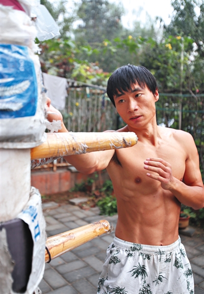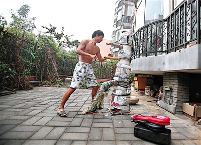 马连华在小区内设置了拳桩,武术队训练结束后他还要加练。