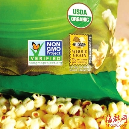 美国爆米花食品包装袋上的非转基因标识和有机标识