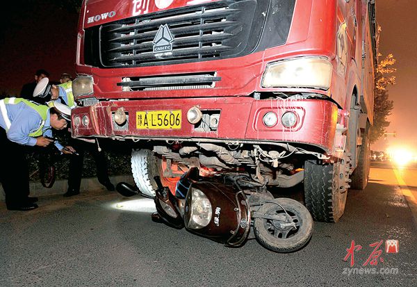 晚9时许,记者赶到现场,沿交叉口向北200米处,车号为豫AL5606的肇事渣土车停在路边,遇难者骑行的电动车卡在渣土车前轮下。