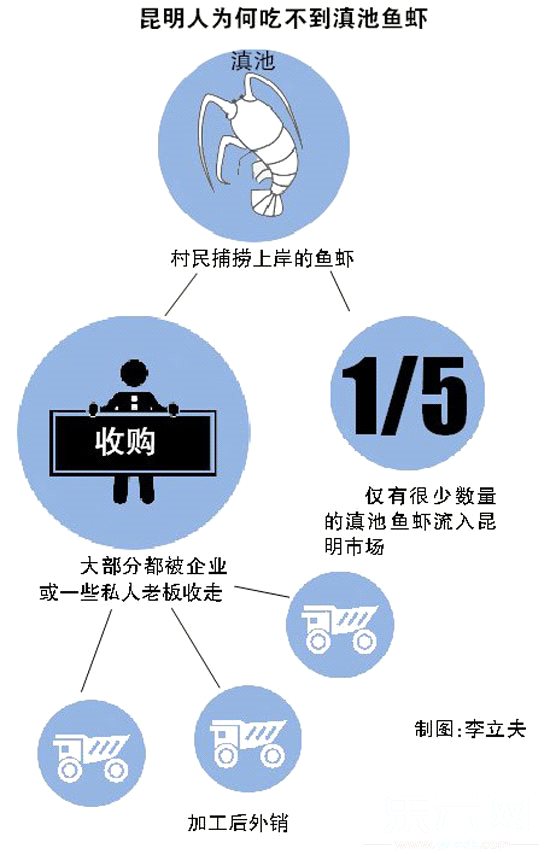 昨天是滇池开湖第二天,除了靠近捕捞点的晋宁沙堤码头、河泊村委会等较集中的鱼虾上岸点和鱼市外,市民能否在昆明市区就近的农贸市场买到滇池银鱼和虾呢?下午2时至4时许,记者走访篆新农贸市场、昆明和平村海鲜市场、昆明福保路六甲综合批发市场等地,都遍寻不着滇池银鱼和虾的影子。昆明市滇管部门执法人员表示,村民捕捞上岸的银鱼和虾,大部分都被企业或一些私人老板收走,加工后外销,仅有不到1/5的数量流入昆明市场,这也是昆明各大农贸市场难觅滇池鱼虾的主要原因之一。