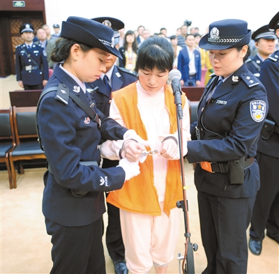 昨日,被告人张立冬(左)、张帆父女在庭审现场。当日,山东招远涉邪教故意杀人案在烟台中院公开宣判,张帆、张立冬被判死刑,吕迎春(张帆的朋友)被判无期徒刑,张航(张立冬之女)、张巧联(张立冬的女朋友)分别被判有期徒刑10年、7年。今年5月,张帆等6名“全能神”教徒在山东招远麦当劳餐厅企图向一名不认识的女子吴硕艳传教,索要电话号码被拒,遂当场用椅子、拖把和拳脚将吴硕艳殴打致死。新华社记者 范长国 摄