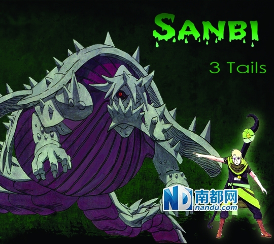 有三条扁尾巴,身上有刺菱的乌龟。三尾出场是没被封印的,随后被“晓”组织捕获并封印。