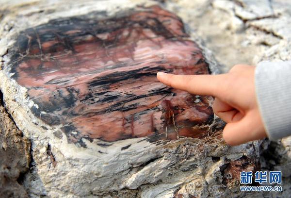 这是10月11日在辽宁朝阳鸟化石国家地质公园拍摄的“七彩树化玉”局部。在辽宁朝阳鸟化石国家地质公园的木化石林,有一件玉化程度很高的木化石标本——“七彩树化玉”。“七彩树化玉”全长约为27米,底径1.8米、重80吨,目前已经全玛瑙矿化,通体呈现红、黄、绿、褐、黑等色彩。经科学考证,“七彩树化玉”属于松柏类,生长于白垩纪,距今已有一亿三千万年,是迄今为止我国境内发现个体最大、保存最完整、玉化程度最好的木化石标本之一。新华社发(白铁军 摄)
