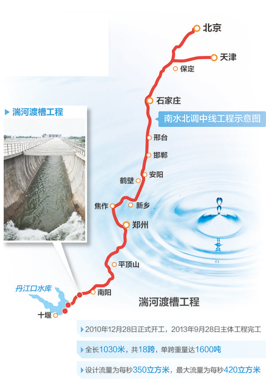 控制性工程湍河渡槽,设计流量为每秒350立方米,最大流量为每秒420立方米,其渡槽内径、单跨跨度、最大流量均属世界首例。