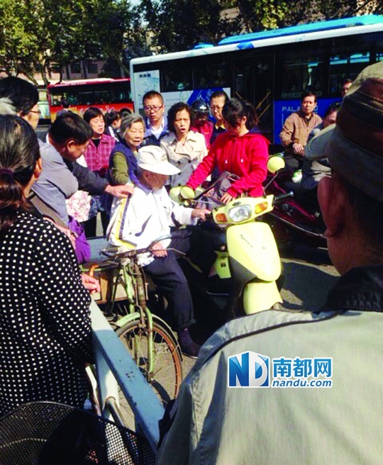 昨日9时39分,南京网友@傷夏-sare发布微博称,“就在刚路过大桥南路(时),一老头自己摔倒,骑车姑娘下来拉他,他就说是那小姑娘撞的,小姑娘都哭了。”@傷夏-sare还称,“所有目击者都说是老头自己摔的还赖人,太不讲理了!结果小姑娘被拽着给了100块钱,老人才让她走了。”