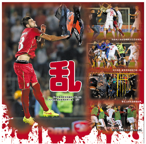 本报讯 (记者 李斌) 欧洲杯预选赛北京时间昨日凌晨出现不和谐一幕,在小组赛I组塞尔维亚队主场对阵阿尔巴尼亚队的比赛中,一面政治旗帜引发双方球员暴力冲突以及大量主场球迷冲入场地。比赛因而提前腰斩,将等待进一步的裁决。