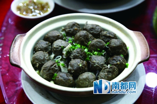 驴肉、驴腩、驴杂、驴皮……驴全身上下都是宝,老黄家的全驴宴也是将驴身上的宝贝利用到了极致,驴肉做成手打驴肉丸、驴腩炖成焖锅、驴肝凉拌……老黄说他家的驴肉口感好是有原因的,大多南方的驴肉店用的都是冰冻驴肉,而老黄家的驴肉,是将活驴从北方长途运送到店,然后在店里宰杀入菜,所以保证了入菜驴肉的新鲜。让吃货赞不绝口的当属这手打驴肉丸,潮州手打肉丸的功力用在了驴肉丸上,嚼在口中不像牛肉丸那么弹牙,但却更鲜香甜美。