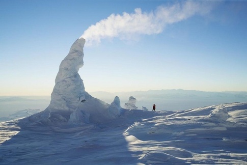 雪烟囱:在北极地区,热气冒出地底后瞬间结冰,于是在火山口附近便形成了大量雪烟囱,火山产生的蒸汽由此得以喷出来。