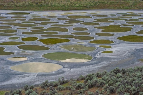 斑点湖:此斑点湖位于加拿大不列颠哥伦比亚省的奥索尤斯,这里是加拿大最热的地区之一。夏季水分蒸发,湖底的矿物质露出来,形成了荷叶般的圆形图案。