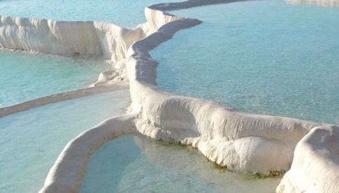 石灰池:在土耳其的温泉里,长年的石灰矿物在温泉边界沉积,形成了一系列白色梯田。刺眼的白色加上水的清澈蓝色,景色十分美妙。