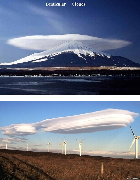 荚状云:这种透镜形状的静止云,通常形成于高空,经常被人们错认成UFO。当稳定的潮湿空气在山区或山脉间流动时,一系列大型的背风波就可能在顺风方向形成。如果温度在波峰处下降或低于露点,空气中的水分就会凝结,形成荚状云。