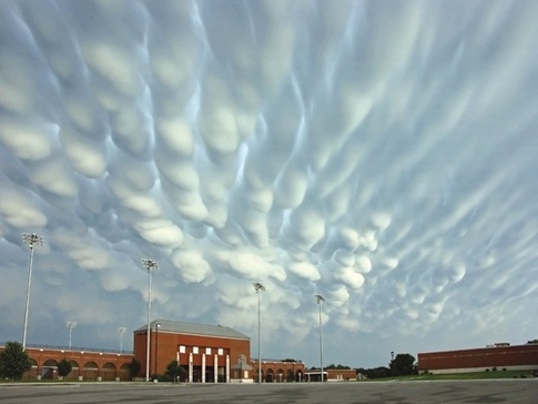 乳状云:这种乳状型积云形成在积雨云下方,当下降的冷空气与上升的暖空气相遇,就会形成像袋子形状的乳状形云。