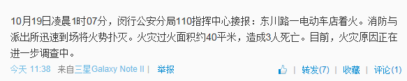 人民网北京10月19日电 据上海市公安局闵行分局官方微博消息,10月19日凌晨1时07分,闵行公安分局110指挥中心接报:东川路一电动车店着火。消防与派出所迅速到场将火势扑灭。火灾过火面积约40平米,造成3人死亡。目前,火灾原因正在进一步调查中。