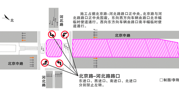 原路口北向东左转前往河北东路方向车辆可提前选择喀什东路、天津北路等道路绕行。