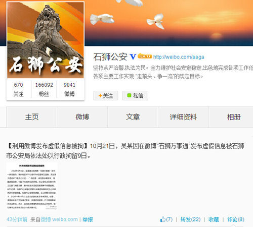 人民网北京10月21日电 据福建省石狮市公安局官方微博消息,今日,网友吴某因在微博“石狮万事通”发布虚假信息被石狮市公安局依法处以行政拘留9日。