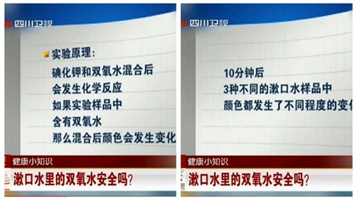 人民网北京10月22日电 据四川卫视消息,通过实验证明,从市场上抽检的几款漱口水都含有一定量的双氧水。专家提醒:漱口水属于药物,应遵照医嘱使用,不可滥用。另外,漱口水有一定的腐蚀作用,用量不宜过大。