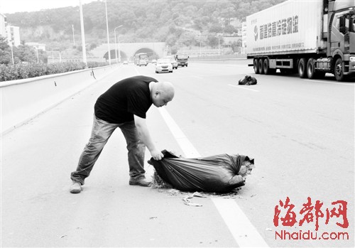 见到路面上有障碍物,过往车辆纷纷避让,由于车速都比较快,现场一度险象环生。随后,记者靠边停车,将部分塑料袋拖到路边,只见里面装满了草皮、树叶等垃圾,随后记者将这几袋垃圾装上车。但还有一些散落在路中间的垃圾,由于路上车辆多,记者无法靠近。