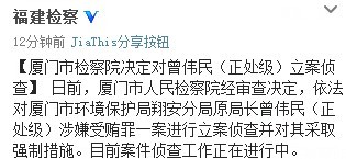 据福建省人民检察院官方微博消息日前,厦门市人民检察院经审查决定,依法对厦门市环境保护局翔安分局原局长曾伟民(正处级)涉嫌受贿罪一案进行立案侦查并对其采取强制措施。目前案件侦查工作正在进行中。