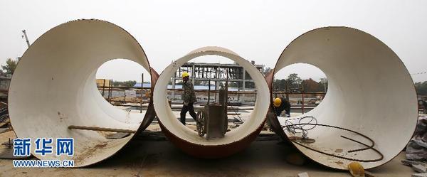 10月23日,在南水北调来水调入密云水库调蓄工程的溪翁庄泵站,施工人员从进水管道旁走过。南水北调中线工程来水将于近日进京,除通过北京市供水管网进入千家万户,富余的水会从团城湖沿京密引水渠输入密云水库。目前,南水北调来水调入密云水库调蓄工程正在紧张施工中,预计将于年底完成主体工程,明年进行联调联试。南水北调来水调入密云水库调蓄工程现场项目部技术组组长周鑫介绍说,此工程全长103公里,来水经过9级泵站加压“攀升”100多米后进入密云水库,回补水源。新华社记者 殷刚 摄