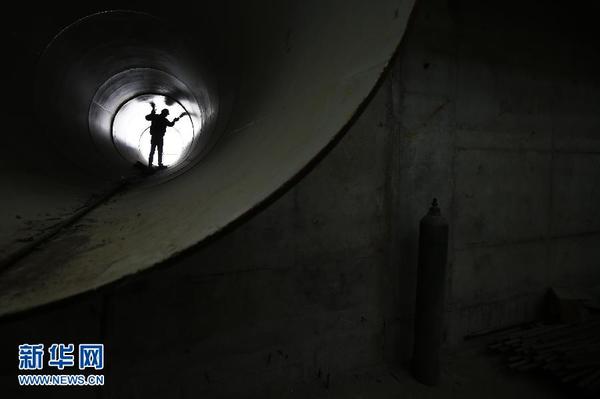 10月23日,施工人员在南水北调来水调入密云水库调蓄工程的溪翁庄泵站检查进水管道。南水北调中线工程来水将于近日进京,除通过北京市供水管网进入千家万户,富余的水会从团城湖沿京密引水渠输入密云水库。目前,南水北调来水调入密云水库调蓄工程正在紧张施工中,预计将于年底完成主体工程,明年进行联调联试。南水北调来水调入密云水库调蓄工程现场项目部技术组组长周鑫介绍说,此工程全长103公里,来水经过9级泵站加压“攀升”100多米后进入密云水库,回补水源。新华社记者 殷刚 摄